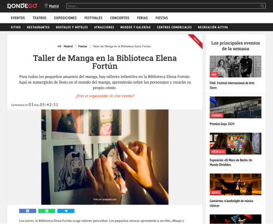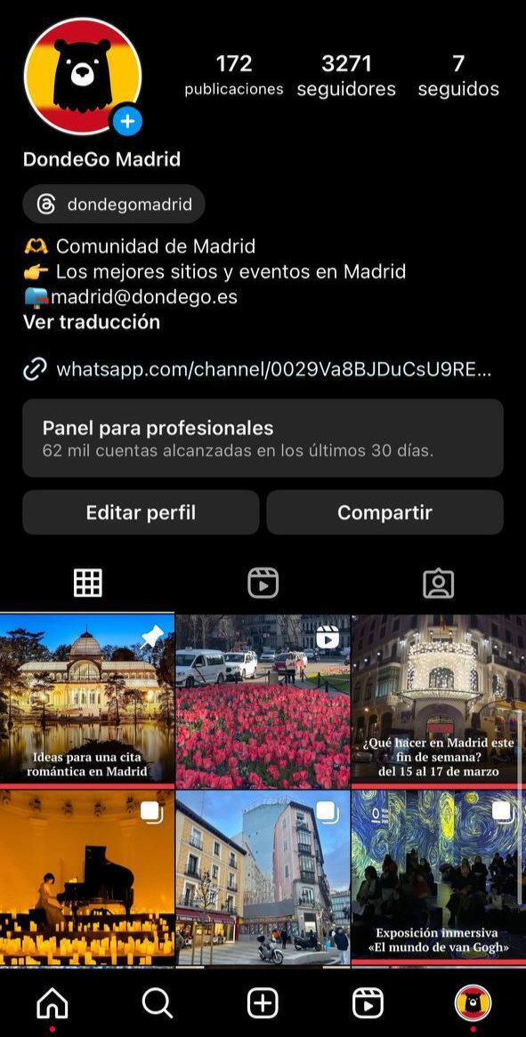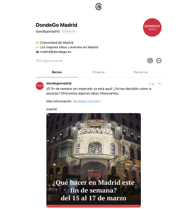 Te contamos sobre los lugares y eventos más interesantes de la ciudad. Nuestra misión es hacer que el tiempo de ocio sea brillante e inolvidable para todos los madrileños y turistas. Frecuentación por mes: 2 000 Usuarios únicos por mes: 1 500 Visitas por mes: 4 000